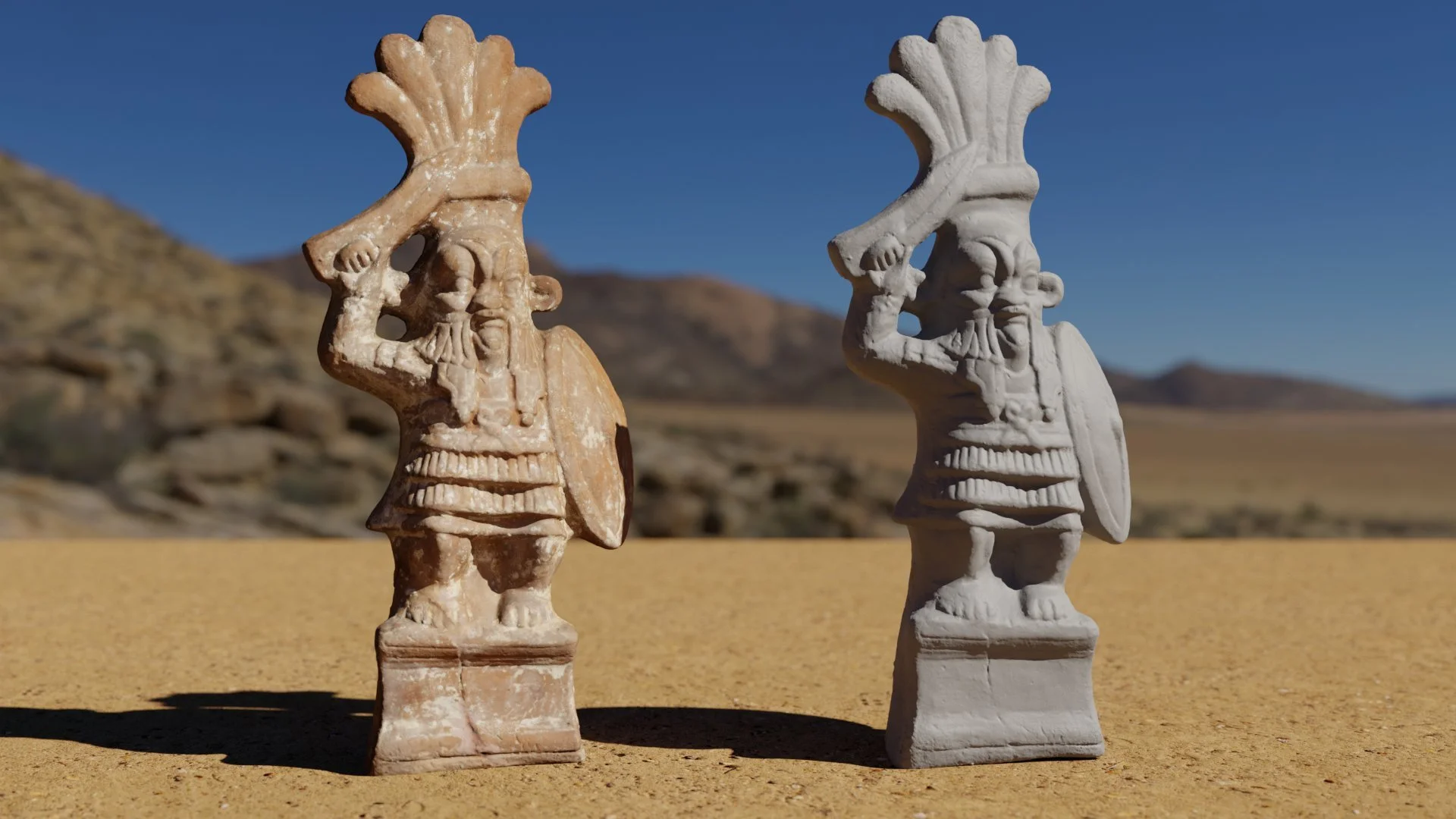 Egyptian god Bes - a digital 3D model with and without colour texture in a virtual environment